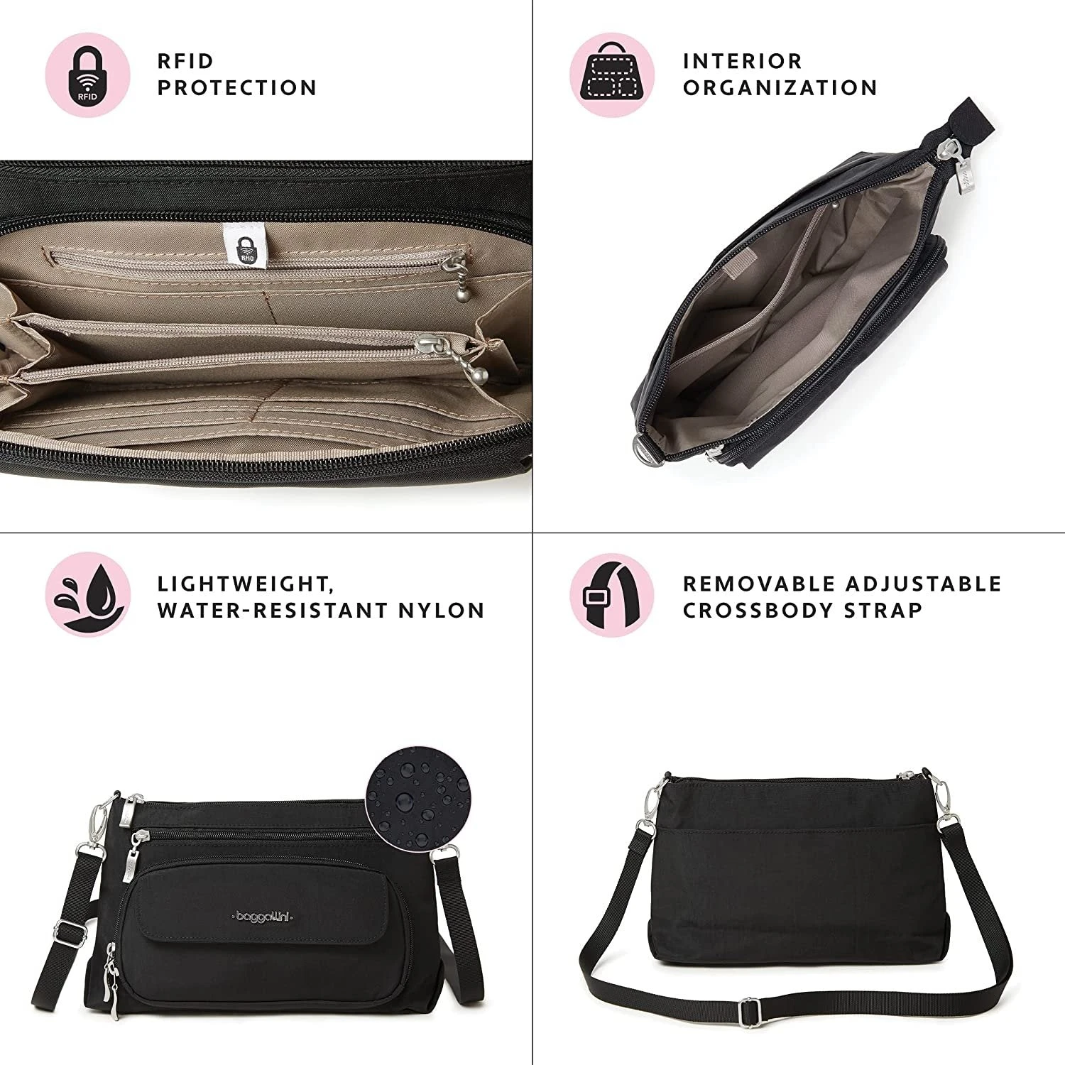 - 52″ removable, adjustable cross body strap