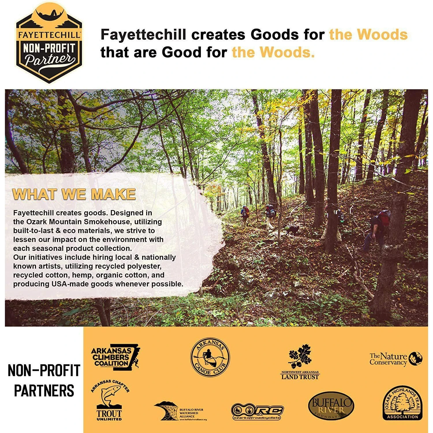 Fayettechill creates Goods for the Woods that are Good for the Woods. Established in 2009, we bring our home in the Ozark Mountains to the world by way of eco-conscious, built-to-last goods. We didn’t start this company as pro athletes or experts in the industry. Fayettechill was established as a refreshed and re-envisioned outdoor culture open to all inspired by nature. We hope to showcase our home in the Ozarks and bring our love of the outdoors to the nation.