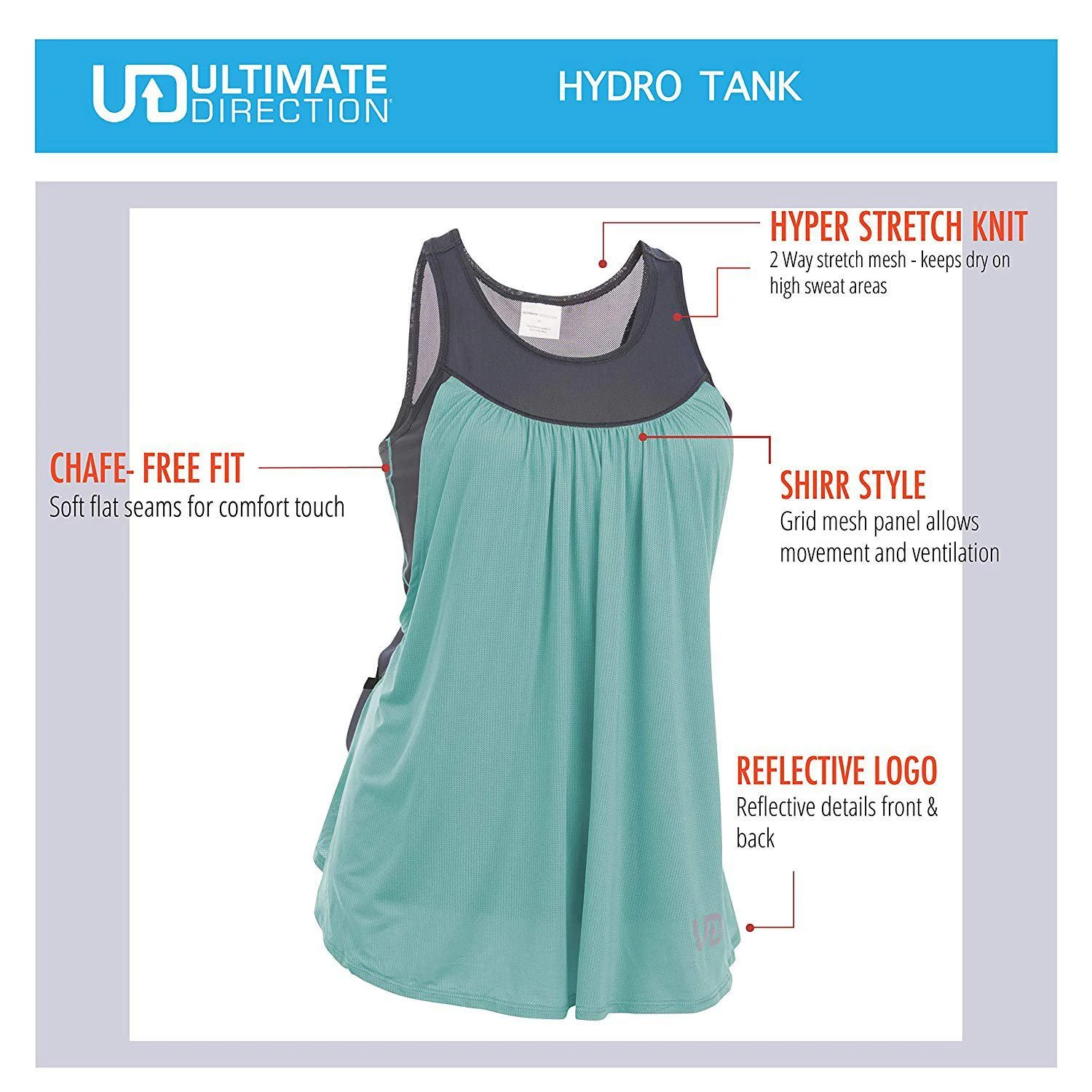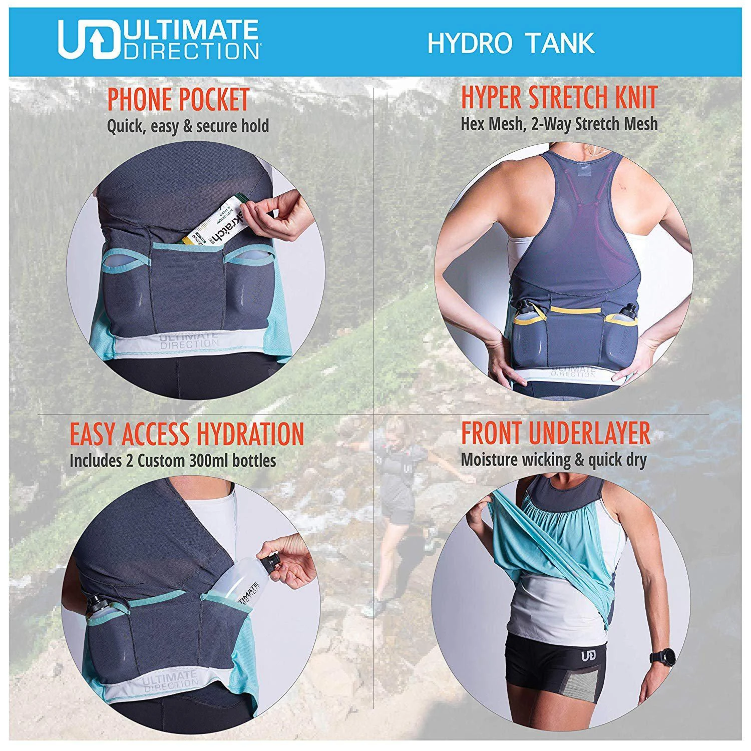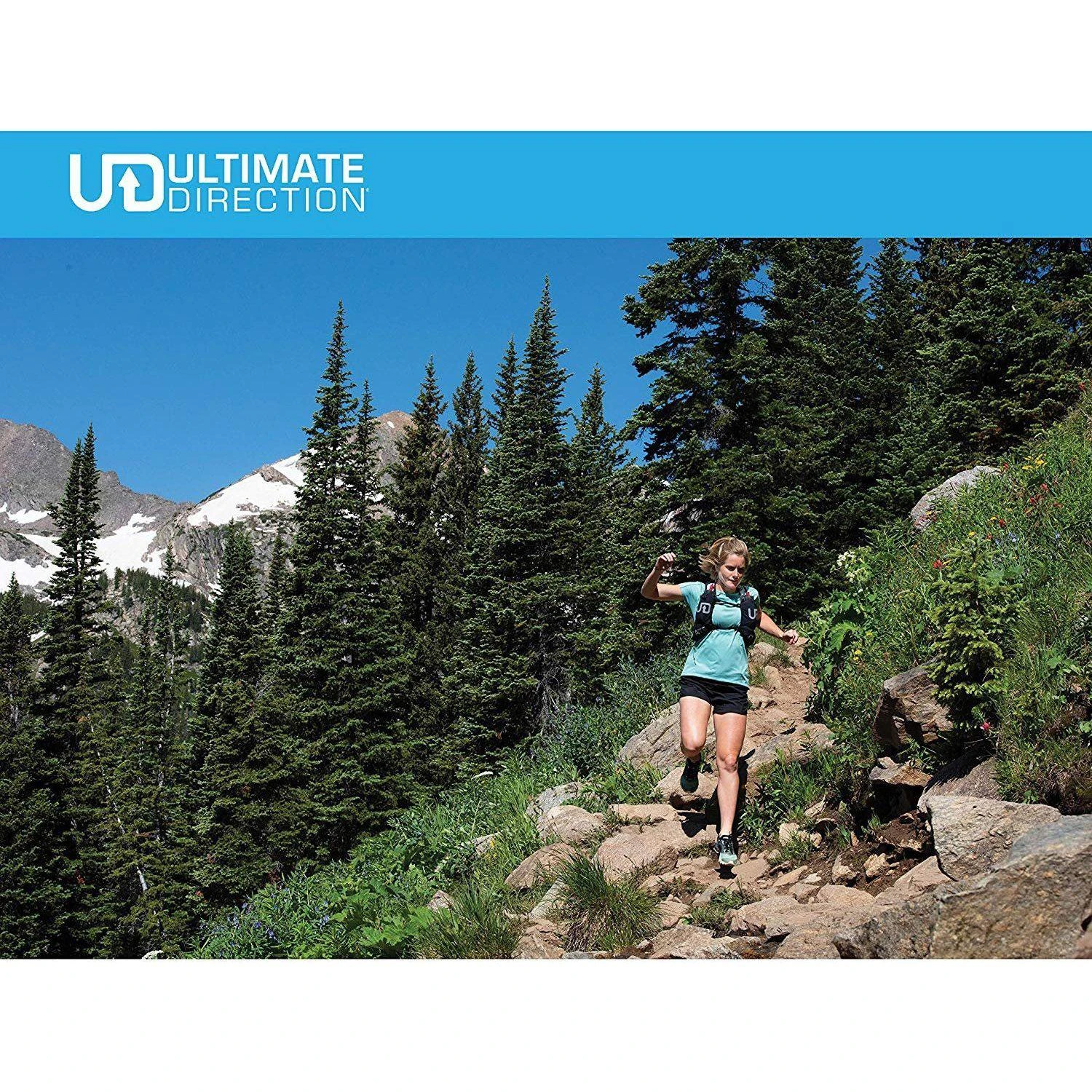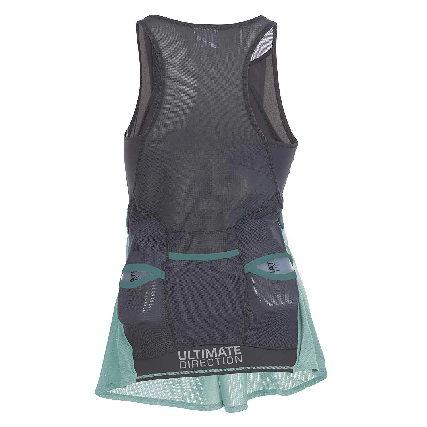 The all new Ultimate Direction Hydrolight Series wearable gear is incredibly comfortable, versatile and ready for the challenge. The Womens Hydro Tank is an innovative running top that that incorporate two 300 ml water bottle pockets right into the lower back. Even with two full 300ml bottles stored in its custom pockets along with your phone it’s comfortable and doesn’t bounce or chafe. The stretch mesh pockets securely hold the bottles. 4-way stretch mesh provide stability and comfort around the waist. A large center back pocket holds an iPhone 8+ and other small items like cash, keys, and small accessories like gloves or a beanie. The breezy, loose front of the tank is made from an ultralight polyester spandex mesh fabric for quick dry and comfort The stretch inner tank is made with chafe free construction for running comfort. Does not include a shelf bra. Reflective logos for low light visibility. Weight: 4 oz / 114 g.