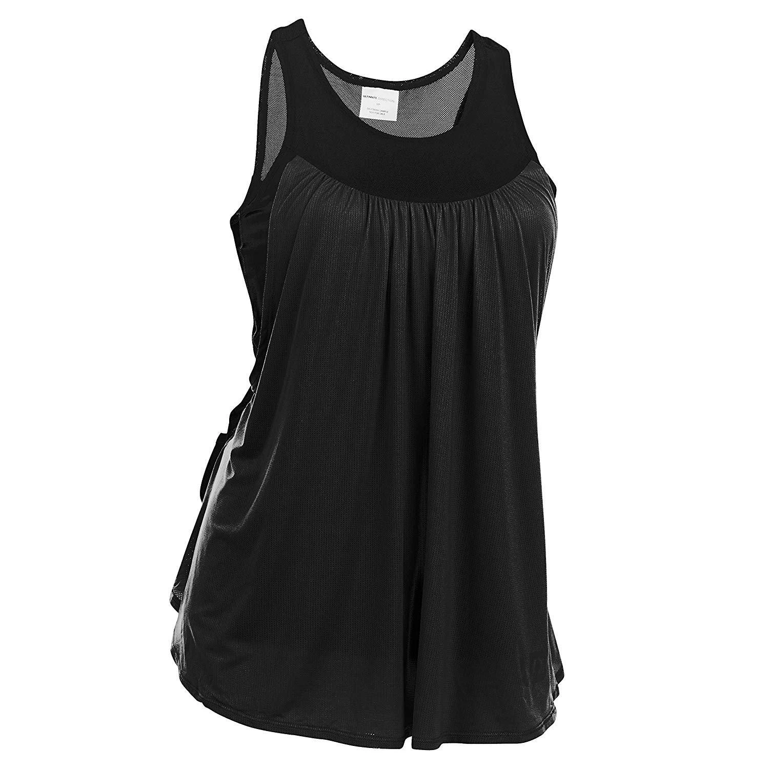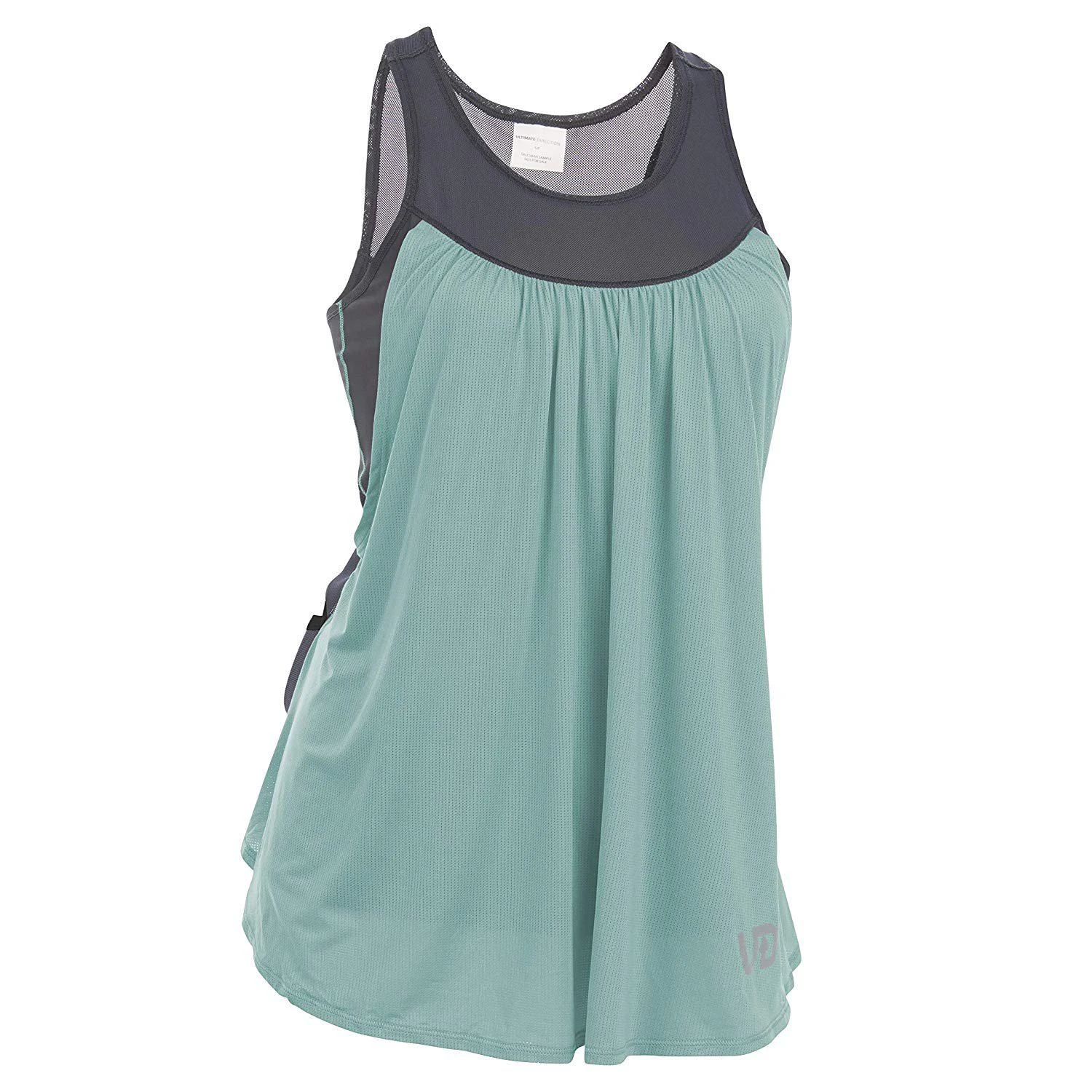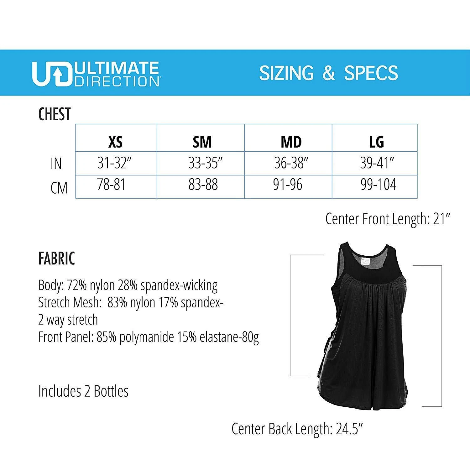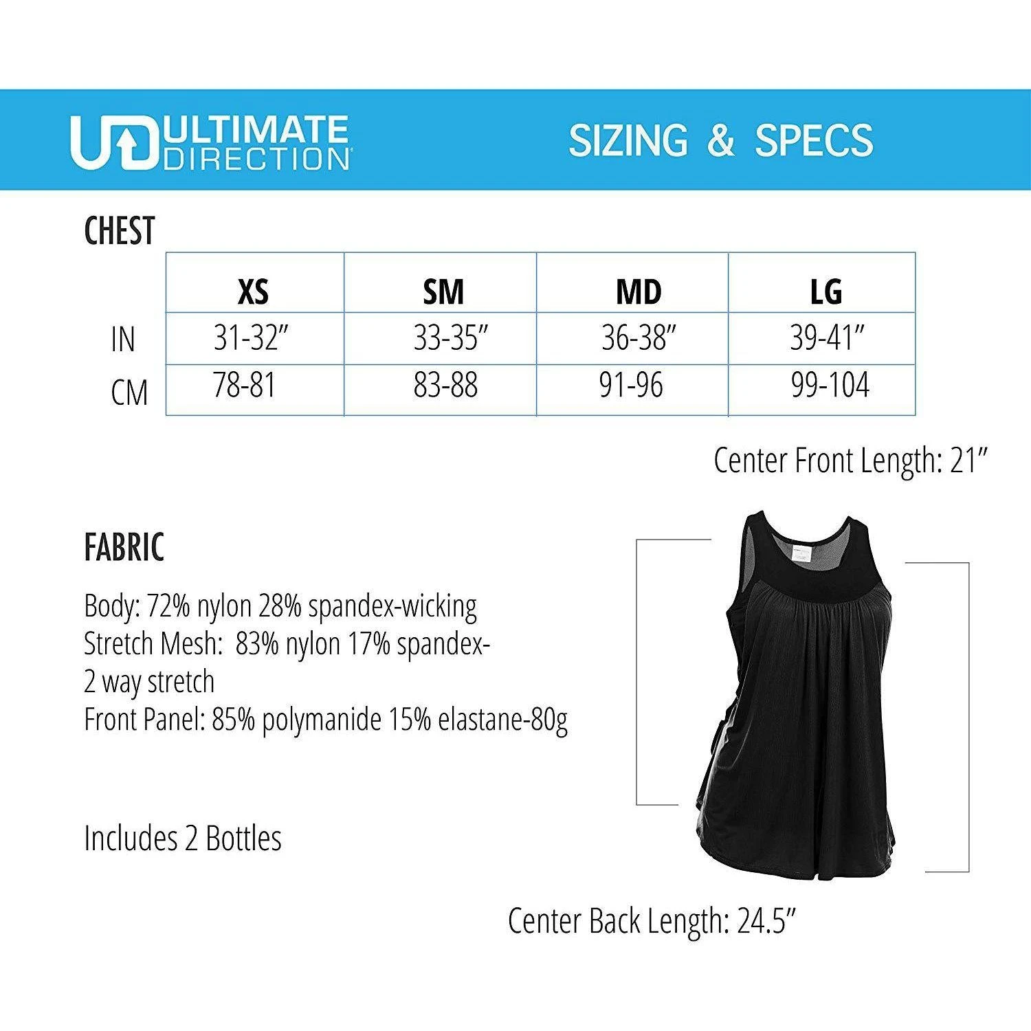 The all new Ultimate Direction Hydrolight Series wearable gear is incredibly comfortable, versatile and ready for the challenge. The Womens Hydro Tank is an innovative running top that that incorporate two 300 ml water bottle pockets right into the lower back. Even with two full 300ml bottles stored in its custom pockets along with your phone it’s comfortable and doesn’t bounce or chafe. The stretch mesh pockets securely hold the bottles. 4-way stretch mesh provide stability and comfort around the waist. A large center back pocket holds an iPhone 8+ and other small items like cash, keys, and small accessories like gloves or a beanie. The breezy, loose front of the tank is made from an ultralight polyester spandex mesh fabric for quick dry and comfort The stretch inner tank is made with chafe free construction for running comfort. Does not include a shelf bra. Reflective logos for low light visibility. Weight: 4 oz / 114 g.