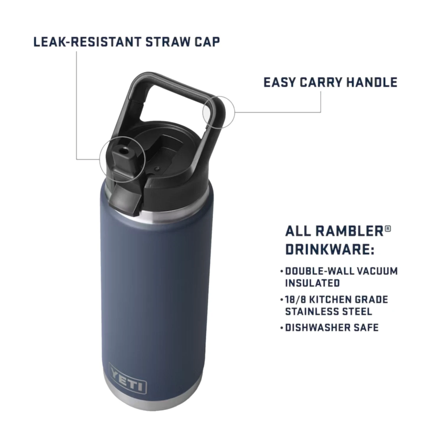 The Rambler® 26 oz. Water Bottle is the goldilocks of our bottle line. It holds just the right amount for a day on the boat or at the beach, while still fitting in your YETI® backpack. It comes with a color-matching straw cap that’s leak resistant and easy to carry (thanks to the TripleHaul™ Handle). Like all Rambler® Bottles, it’s over-engineered and double-wall insulated to keep your water cold until the last sip, and it’s dishwasher safe for easy cleaning. Plus, it comes with a wide-straw insert, so you get more drink with every sip.
